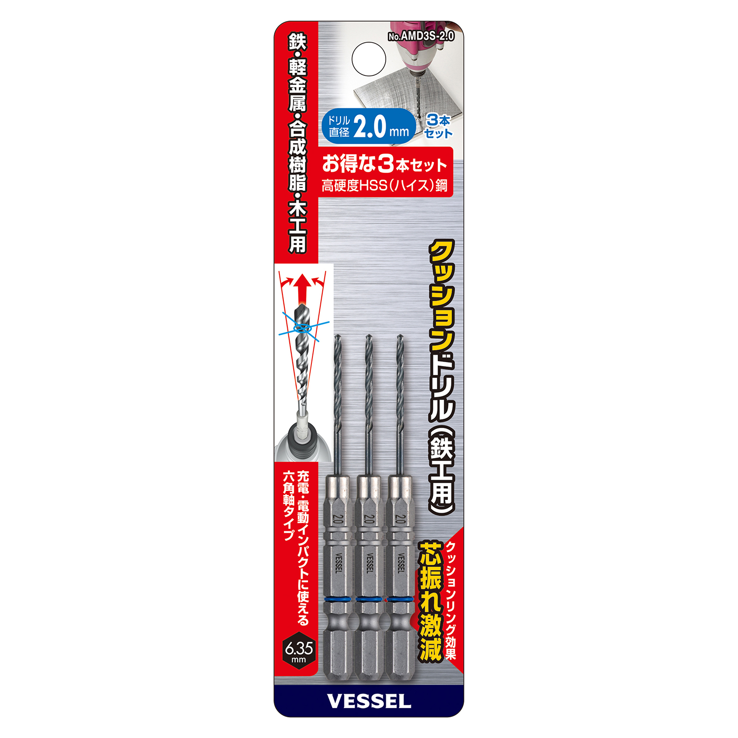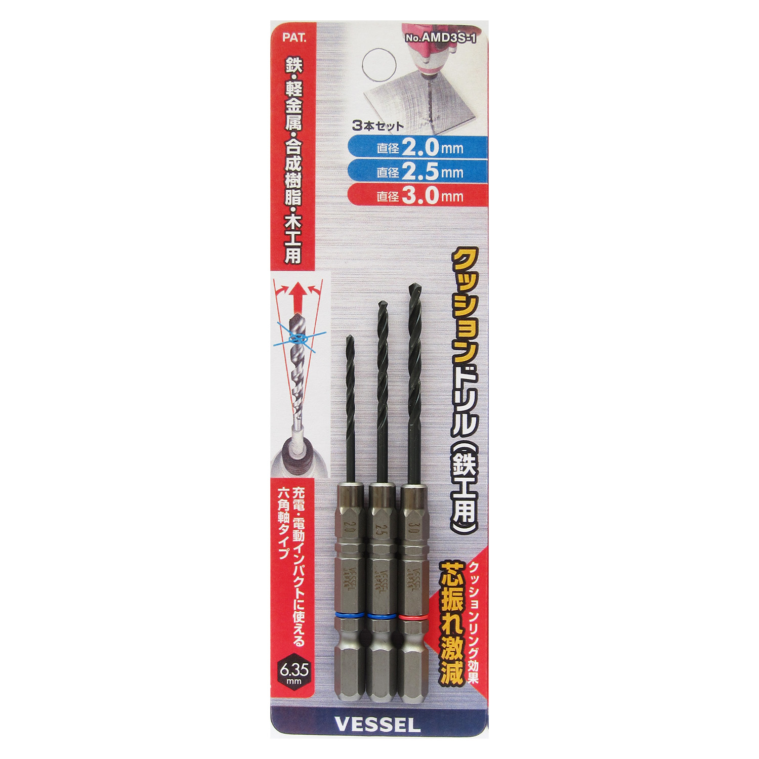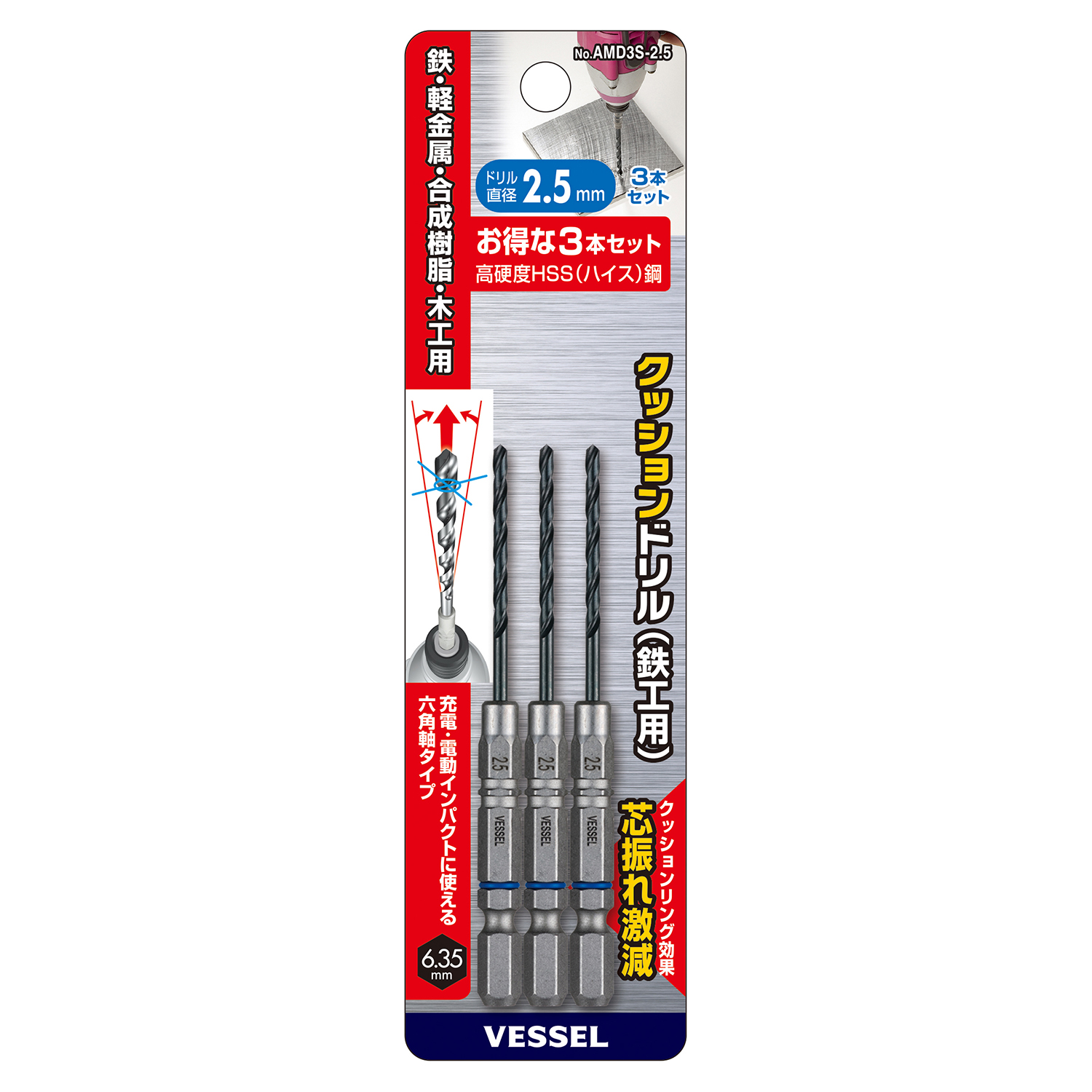 缓冲钻头(铁工用)3支装 No.AMD3S-2.5(Φ2.5mm 3支)