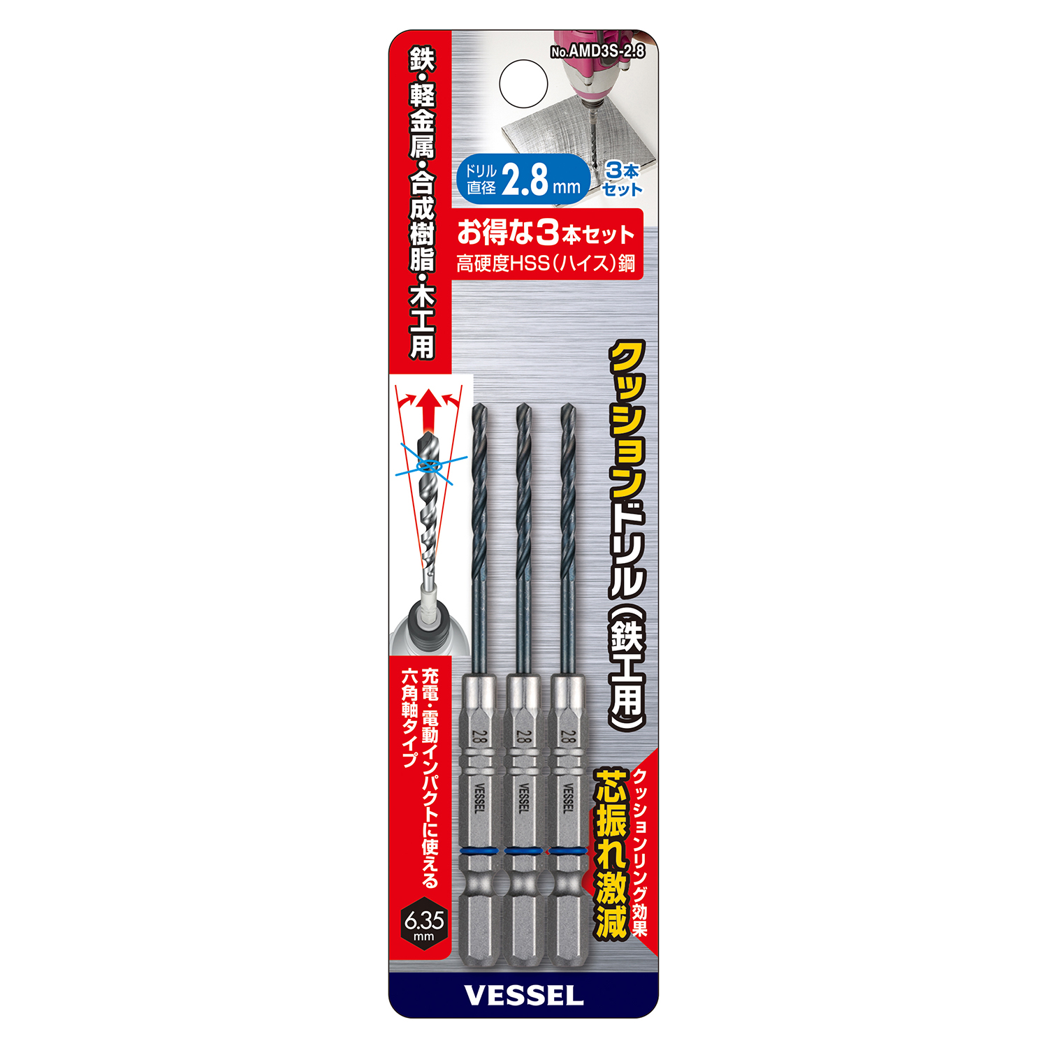 缓冲钻头(铁工用)3支装 No.AMD3S-2.8(Φ2.8mm 3支)