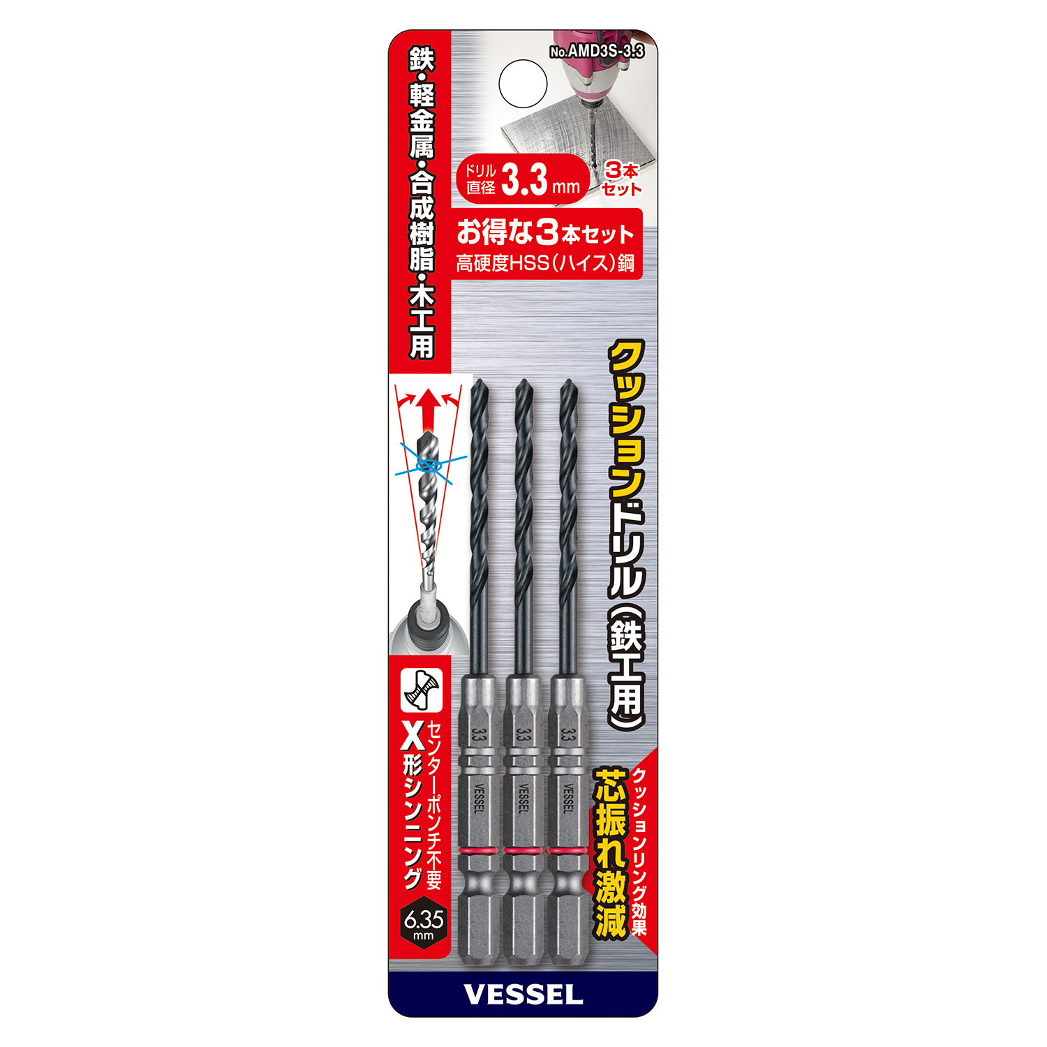 缓冲钻头(铁工用)3支装 No.AMD3S-3.3(Φ3.3mm 3支)