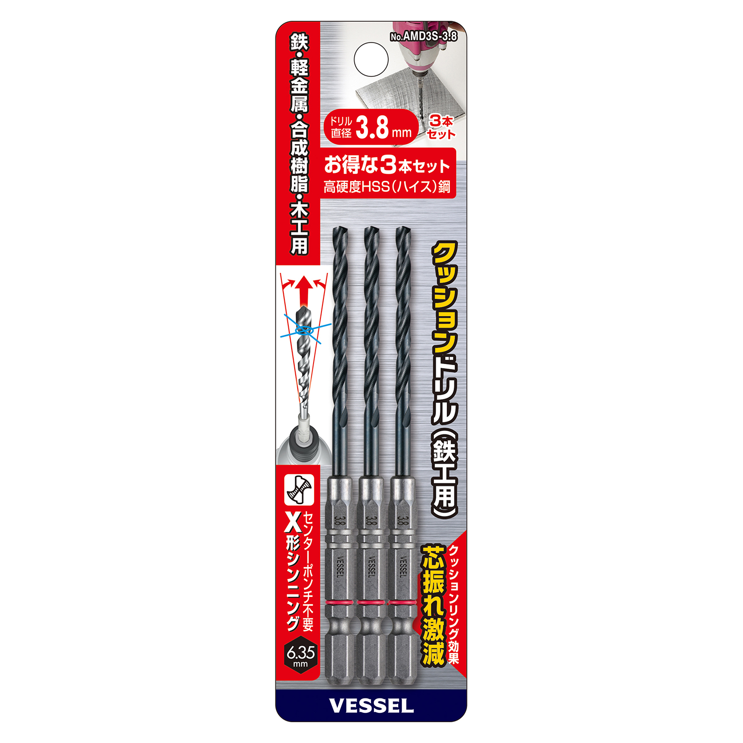 缓冲钻头(铁工用)3支装 No.AMD3S-3.8(Φ3.8mm 3支)