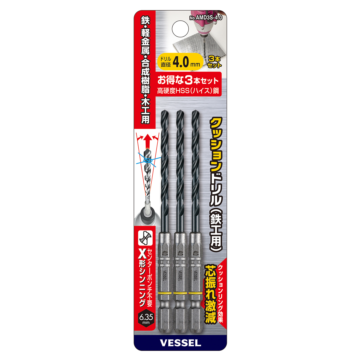 缓冲钻头(铁工用)3支装 No.AMD3S-4.0(Φ4.0mm 3支)