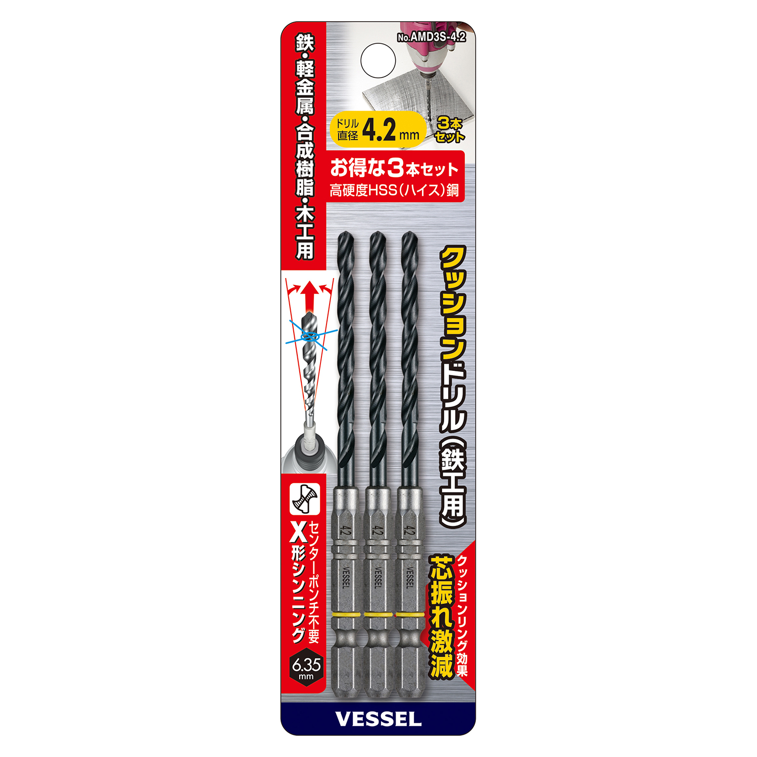 缓冲钻头(铁工用)3支装 No.AMD3S-4.2(Φ4.2mm 3支)
