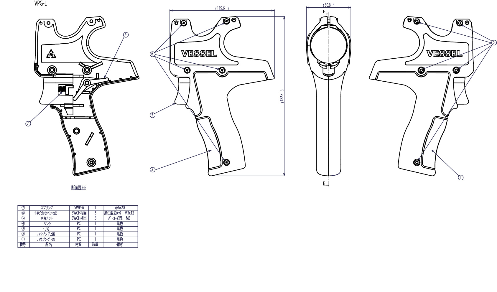 外壳上盖×1、外壳下盖×1、扳机×1、连杆×1、弹簧×1、M3盘头螺钉×5