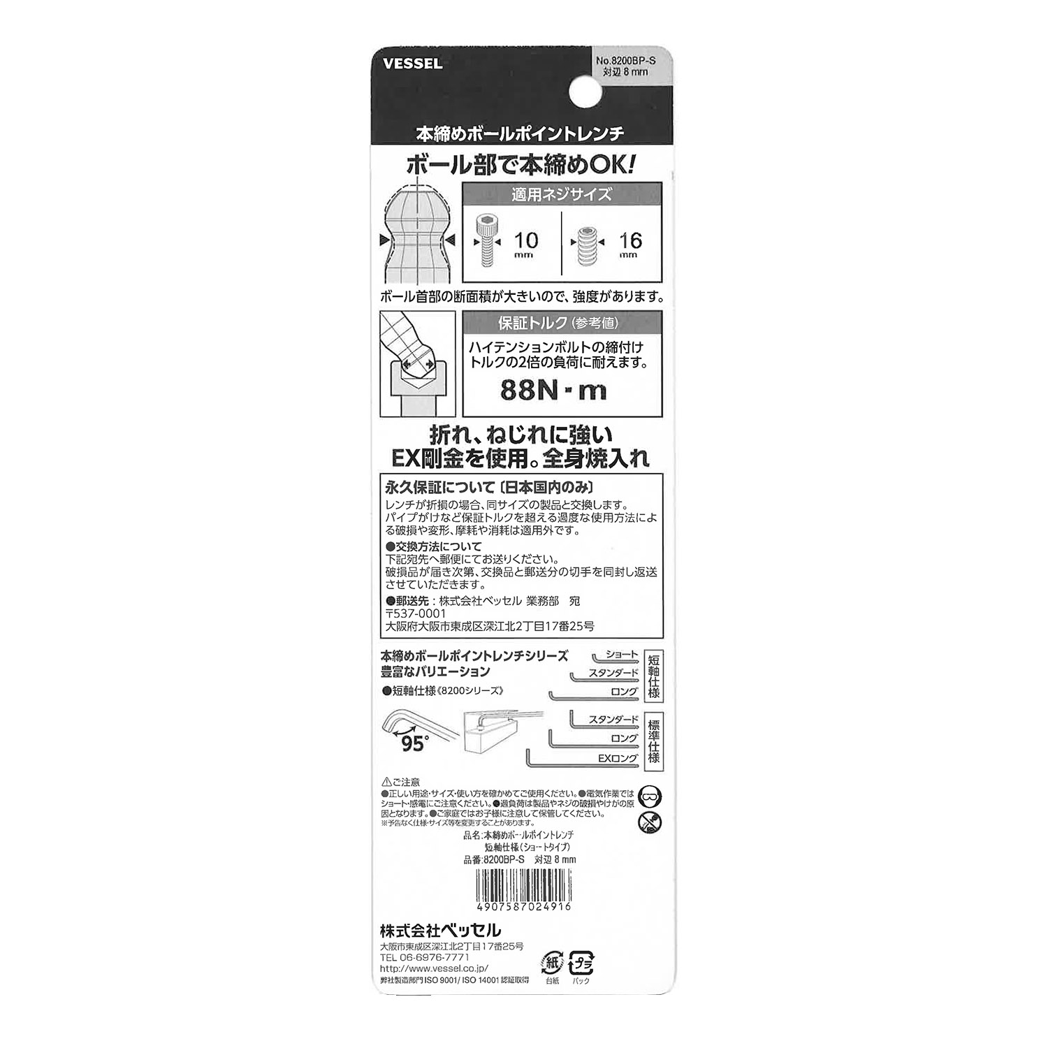 标示 主体总长mm L型扳手的短边尺寸mm 主体重量g 内包装数量 外包装数量 日本JAN条形码