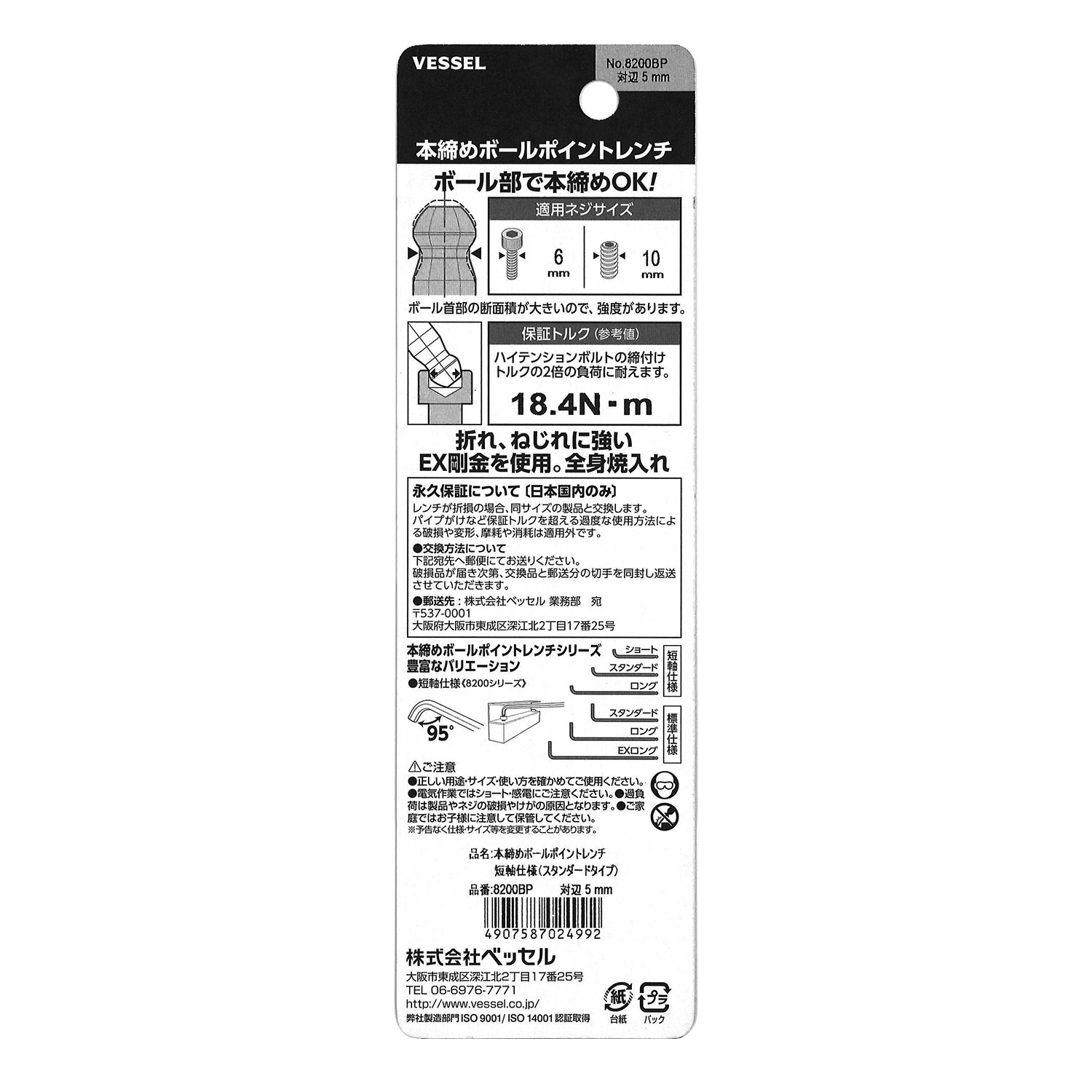 标示 主体总长mm L型扳手的短边尺寸mm 主体重量g 内包装数量 外包装数量 日本JAN条形码
